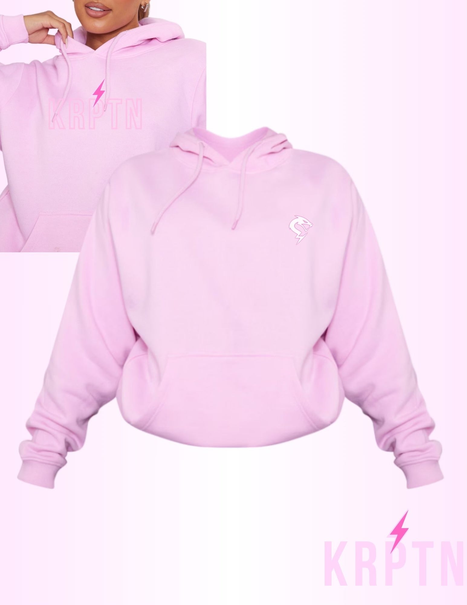 Designed with a soft, premium fleece blend, this hoodie delivers all-day comfort whether you’re hitting the gym, running errands, or lounging. The light pink color gives it that perfect feminine touch, while the bold lightning logo and subtle KRPTN branding add the signature athletic edge your brand is known for.